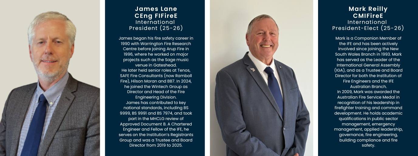 International President (25-26), James Lane, serves as a powerful voice for the profession—championing best practice, engaging with key stakeholders, and attending major events throughout the international fire sector. Drawing on decades of technical, strategic and industry experience, James brings a deep commitment to integrity and professional excellence to the role.